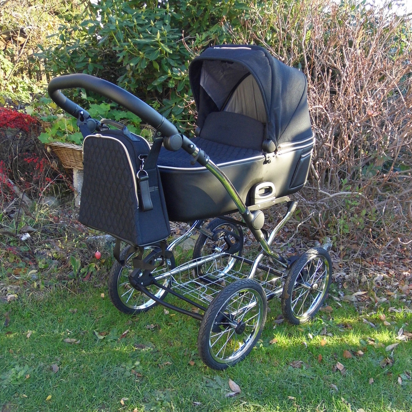 Náš houpací retro kočárek má velké nafukovací kola (14 palců) s ložisky. Je opatřen nášlapnou brzdou pro dokonalé zabrždění.