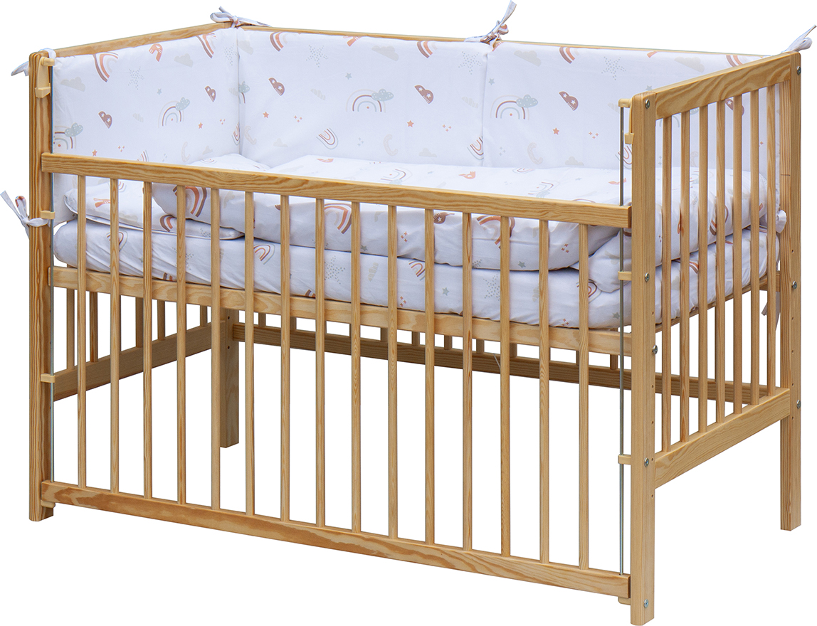 1. Dětská dřevěná postýlka 120 x 60 cm - přírodní, masiv borovice, stahovací bok, 6 poloh roštu