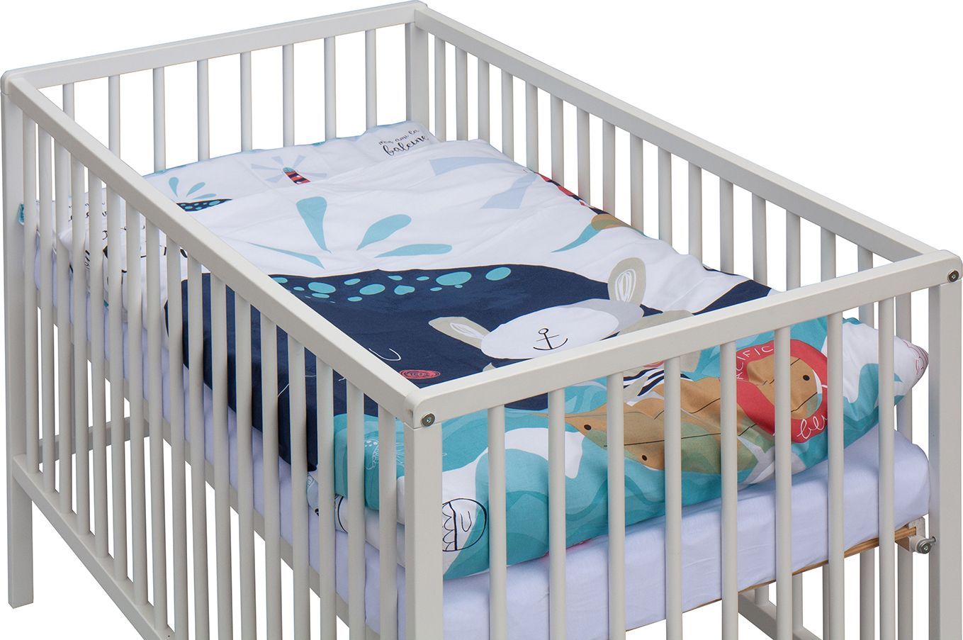 1. Dětská dřevěná postýlka 120x60 cm - bílá, masiv buk, 3 vyndavací příčky, 3 polohy roštu