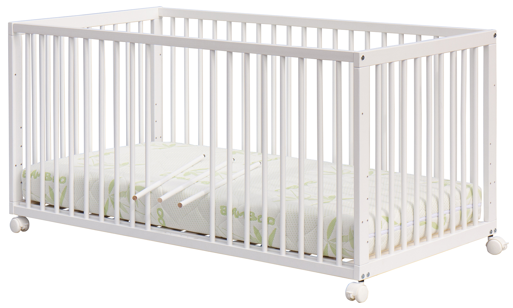 Nohy postýlky jsou připravené pro snadné přimontování koleček.