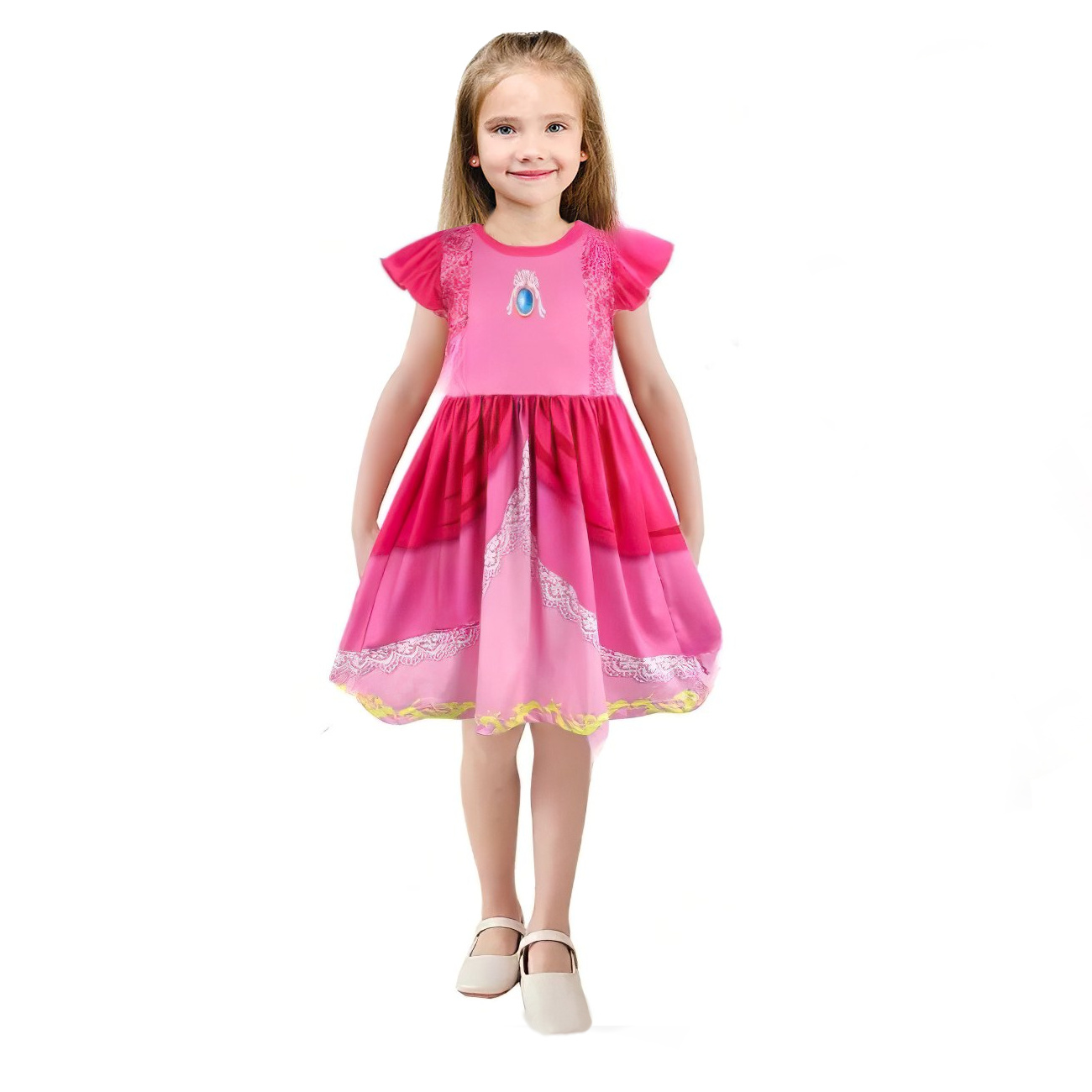 Šaty jsou navrženy v sytě růžových a fialových odstínech s potiskem krajky a ozdob, které evokují královský styl. Na hrudníku je tištěný modrý drahokam s korunkou, který celému modelu dodává kouzelný detail.