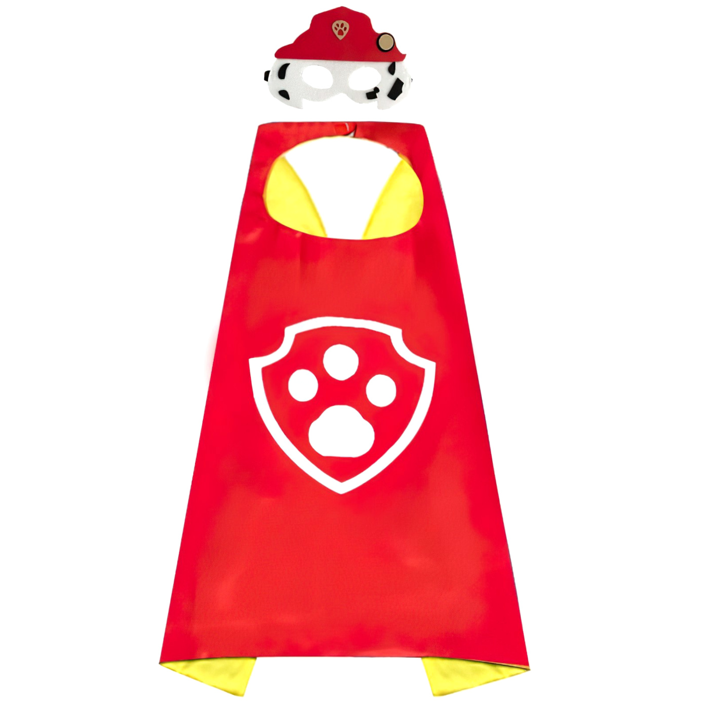 Sada obsahuje červený plášť s logem Tlapkové patroly a stylovou masku připomínající hasičskou čepici a bílé chloupky Marshalla – dalmatina, který je vždy připraven pomáhat.