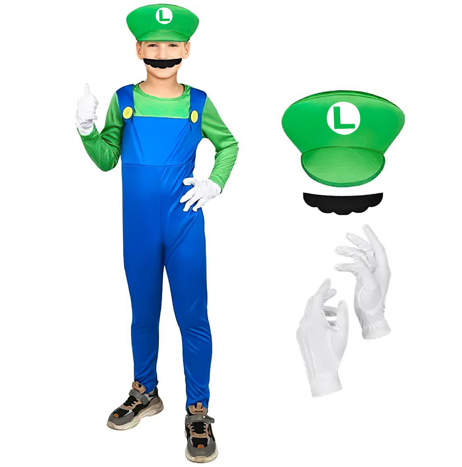 Tento převlek zahrnuje všechny nezbytné prvky, aby se vaše dítě mohlo proměnit v odvážného Luigia – součástí je overal s designem modré kombinézy s kšandami a zeleným tričkem, zelená čepice s logem „L“, bílé rukavice a nalepovací černý knírek, který dotváří autentický vzhled.