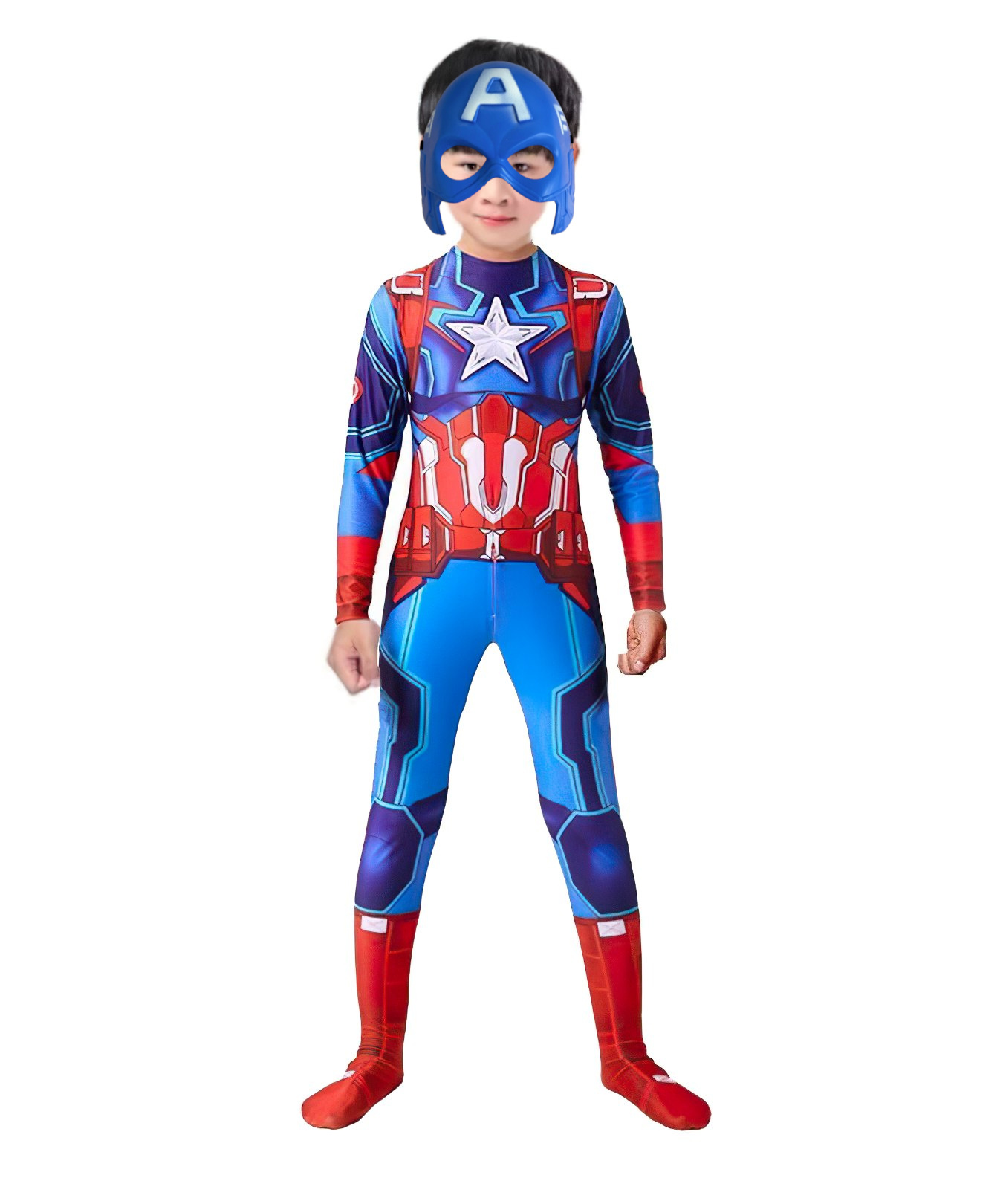 Kostým se skládá z celotělového overalu s realistickým potiskem ikonického obleku, který obsahuje hvězdu na hrudi, červené a bílé pruhy a modré detaily. Součástí je také plastová maska s písmenem "A", která dodává kompletní vzhled statečného Avengera.