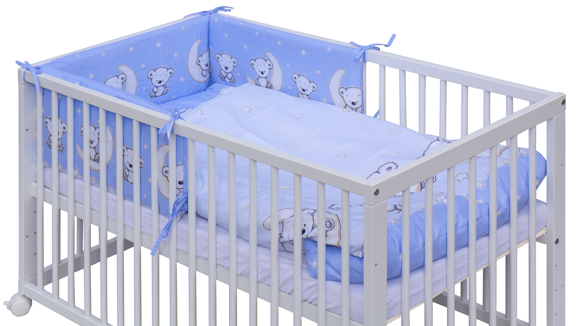 - Ohrádková postýlka s vyndavacími příčkami - bílá - 120x60 cm s kompletní výbavou Toro Barva soupravy: Toro modrá