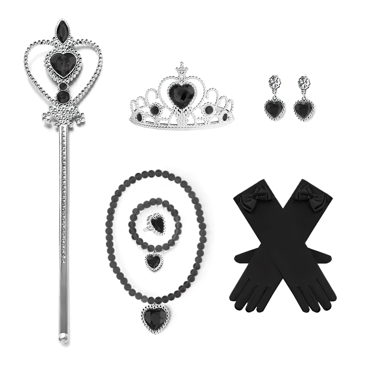 Sada zahrnuje černé rukavice, čelenku s ozdobou, náhrdelník, náušnice, prsteny a další tematické doplňky inspirované gotickou estetikou Wednesday. Všechny šperky a ozdoby jsou sladěny do černé a stříbrné barvy, které podtrhují ponurý, ale elegantní styl postavy.